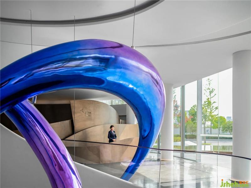 天花空間曲線流麗,意圖展示出一道時(shí)空隱喻,連結(jié)著杭州的過(guò)去、現(xiàn)在、未來(lái)。藝術(shù)裝置「躍升」盤(pán)旋空中,流動(dòng)的態(tài)勢(shì)如滔滔流水,完美衍生出項(xiàng)目地理位置的先天優(yōu)勢(shì)。