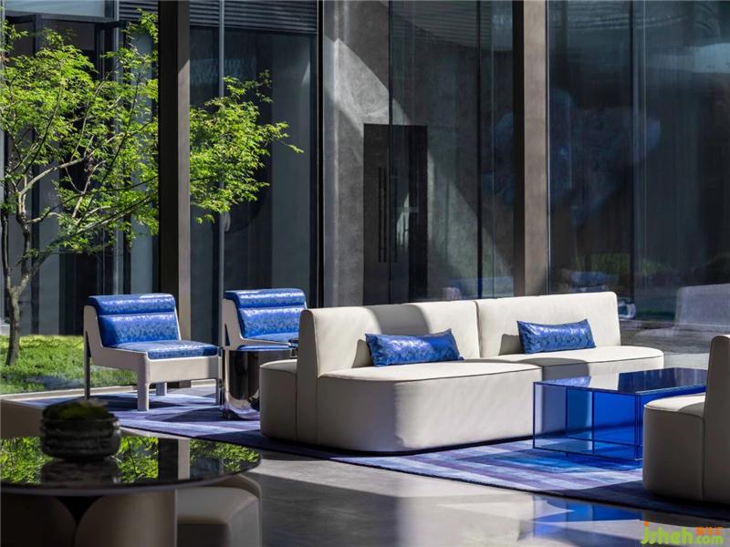 空間采光與室外景觀的融合也被充分考慮,設(shè)計(jì)師大面積運(yùn)用落地窗引景入室。綠植枝形婀娜,蔥蔥郁郁的顏色映照于空間中。深藍(lán)座椅曲線流利,微風(fēng)襲襲中,自然相映的都市風(fēng)味撲面而來(lái)。