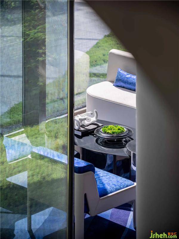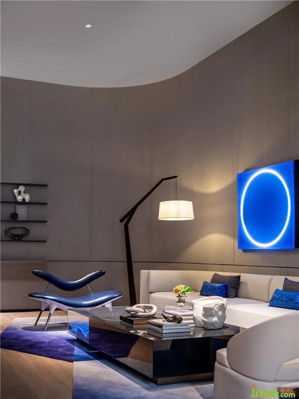 VIP室整體呈現(xiàn)未來(lái)感,設(shè)計(jì)師以一抹灰度為空間定調(diào),極簡(jiǎn)空間強(qiáng)調(diào)現(xiàn)代、科技感。藍(lán)色中一抹圓的藝術(shù)裝置成為視覺(jué)中心,像一個(gè)時(shí)間蟲(chóng)洞,引人順著光的指引,在時(shí)空的隧道中旅行。