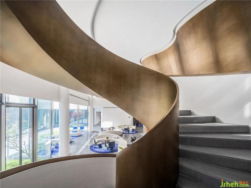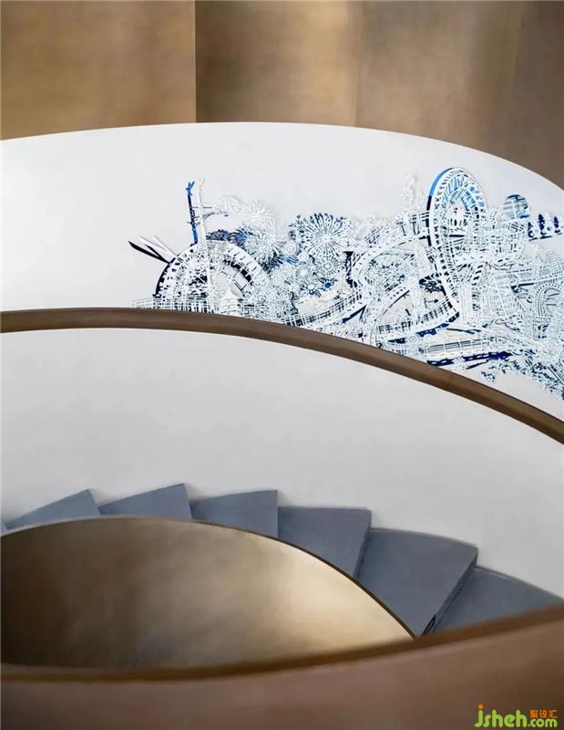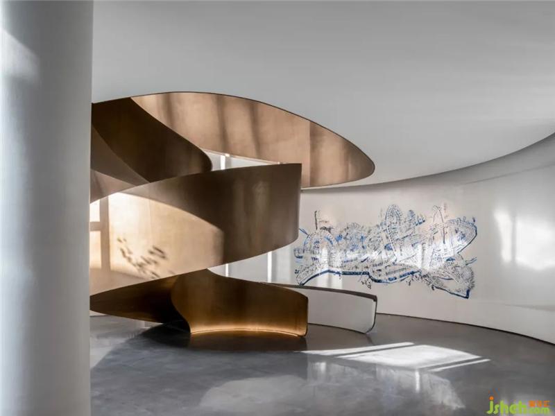 在曲面的夢(mèng)幻空間中游走,盤(pán)旋而上的旋轉(zhuǎn)樓梯營(yíng)造出一份驚喜感。你既能在其中體會(huì)由光呈現(xiàn)的空間隱喻,又能感受到景觀穿行于其中的微妙樂(lè)趣。在墻面設(shè)計(jì)中,除了極簡(jiǎn)的純白與圣光相映,設(shè)計(jì)師仍保留了區(qū)域代表性元素,使其突出功用性中信息的傳遞。