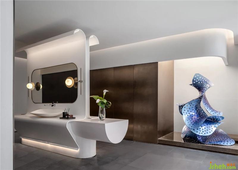衛(wèi)生間藝術(shù)裝置呈現(xiàn)為水浪流動(dòng)的形態(tài),仿佛錢(qián)塘江的潮水,流露出競(jìng)奔不息、永立潮頭之勢(shì),構(gòu)筑出地域文化的精髓和靈魂。臺(tái)盆設(shè)計(jì)延續(xù)空間的「水」元素,鏡立面頂部猶如延伸出一朵浪花杭州售樓處設(shè)計(jì),為空間帶來(lái)生趣。