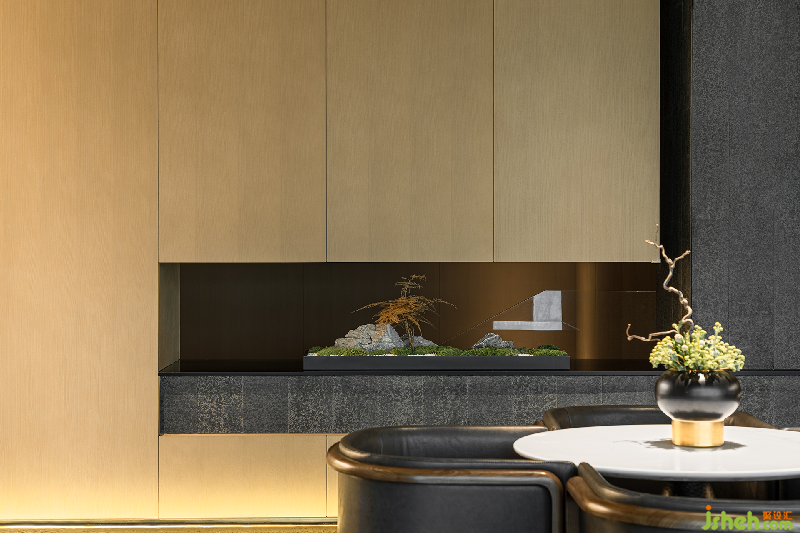 前廳以巧妙的分割剝離出一個(gè)線條與層次分明的包容性空間。石面粗糙質(zhì)地帶來的是與自然的原始風(fēng)味深刻銜接之感,綠植元素融入其中體現(xiàn)為東方設(shè)計(jì)特有的禪意。
