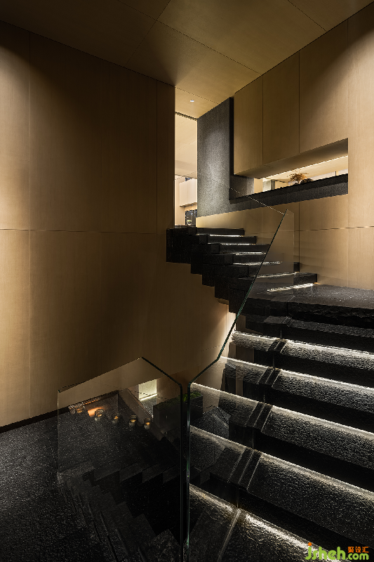 過廊透過盡頭的玻璃窗巧妙引入自然光。原木材質(zhì)是這一區(qū)域的材質(zhì)基底,與石材質(zhì)、自然光交織,帶來清簡、禪意的氛圍。