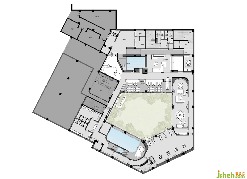 空間功能形態(tài)多元。戲水池空間與戶(hù)外景觀融為一體,休閑與舒緩中,得以與自然實(shí)現(xiàn)能量交換。天花切割形態(tài)柔美,帶來(lái)局部光照的調(diào)和。