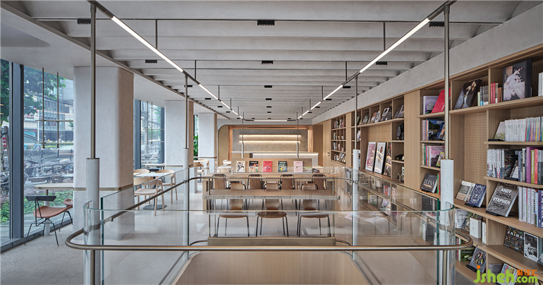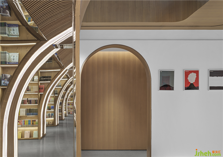 自然光散落墻體,使一抹純白映照出空間的詩意。書店設(shè)計(jì)原木材質(zhì)的巧妙覆蓋如同自然生長于墻體,自然與建筑空間無縫銜接,顯露時(shí)間釀就下樹木原生材質(zhì)的自然光澤與質(zhì)感,帶來的是城市生活方式對自然的崇敬與回歸。