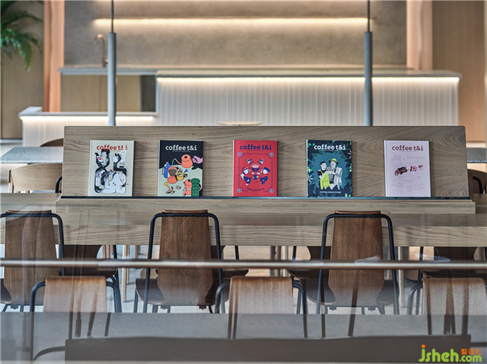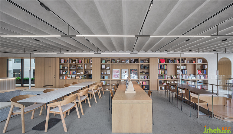 咖啡廳長桌縮減了陌生人之間的距離,加強(qiáng)自由的社交氛圍感。曲面天花如同跳躍的浪花,強(qiáng)化空間體量,秩序分明,動線清晰。