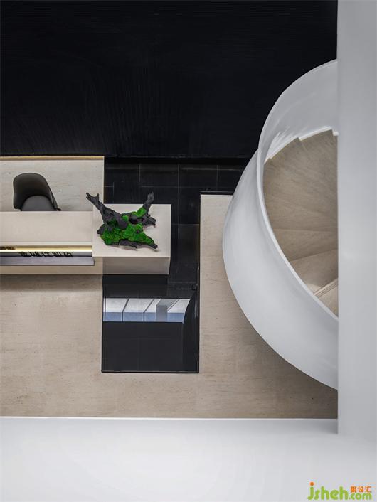旋轉樓梯擁有卷曲的體型,如含苞似放的花朵,又像是一只卷曲的蝸牛??臻g的純白之詩因形體而擁有浪漫質感,光的布局似月光一般晶瑩剔透。