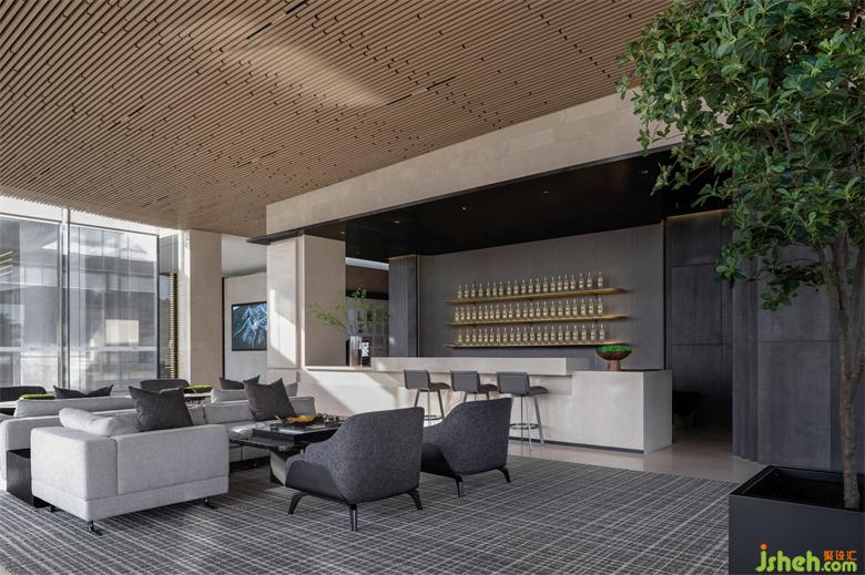 水吧臺是一種擁有特定功能屬性的空間,強調松弛感與休閑的社交氛圍。設計師通過酒瓶形成強烈的視覺符號,在無需更多墜飾的情況下,流露輕奢、灑脫之味。