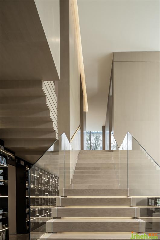 閱讀是對精神世界的探索,大量的書籍在此處拼裝成一道風(fēng)景線,與敞開式的空間對望。黑白色詼諧地交織變幻,背倚書閣書卷。