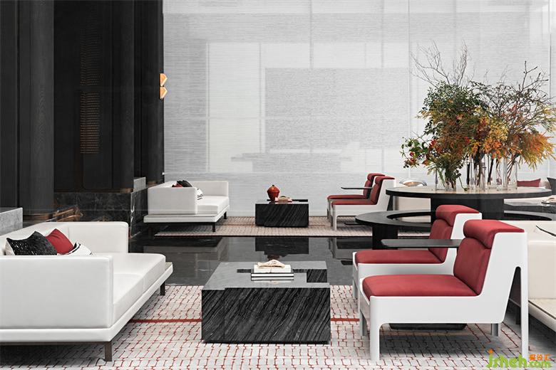 大理石與金屬質(zhì)感的組合,搭配深暗紅色絲絨面料的點綴,傳統(tǒng)屬性與精致細(xì)膩的元素相碰撞,是對古典色彩、現(xiàn)代材質(zhì)的再探索。