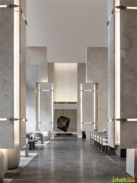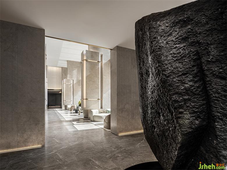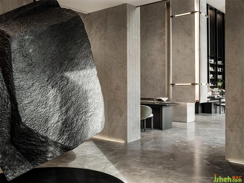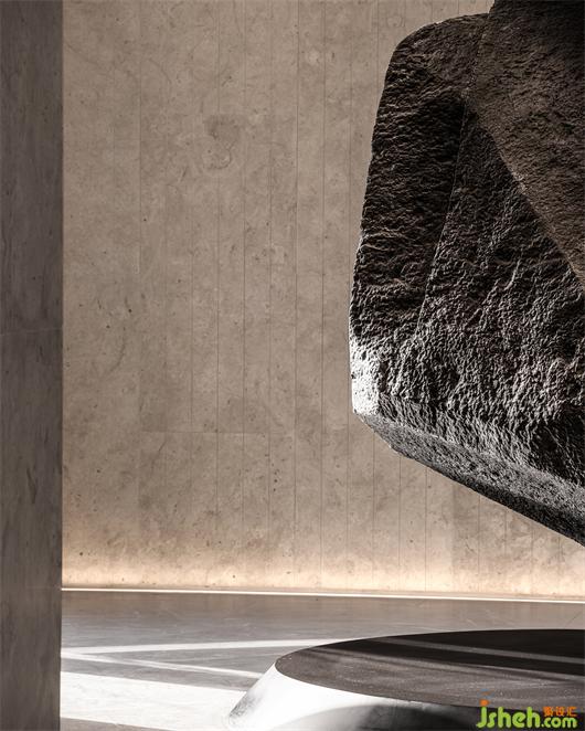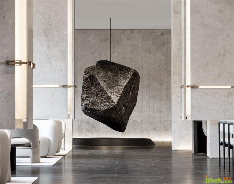 從洽談區(qū)望向盡頭,藝術(shù)裝置“Wurf”赫然懸立,雕塑語(yǔ)言傳遞靜默氣質(zhì),亙古悠遠(yuǎn)。