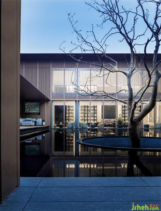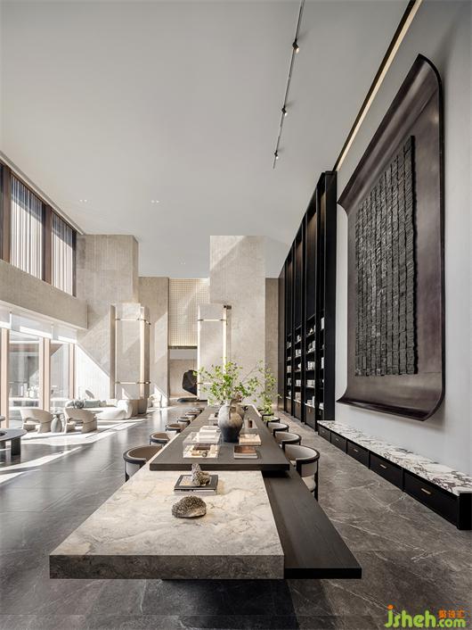 從序廳“詩之山水”到中庭正堂的“匠心書生”的書院文化,最后山重水復(fù)回歸山水,整體打造了一個流暢的觀景動線。