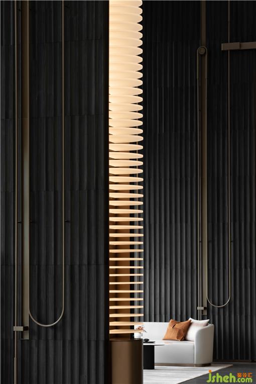 冷峻的柱體雕刻細(xì)節(jié)中的肌理變化,不銹鋼底座搭配金色燈柱,沉著的低調(diào)在材質(zhì)的疊加中營(yíng)造的靜謐氛圍。