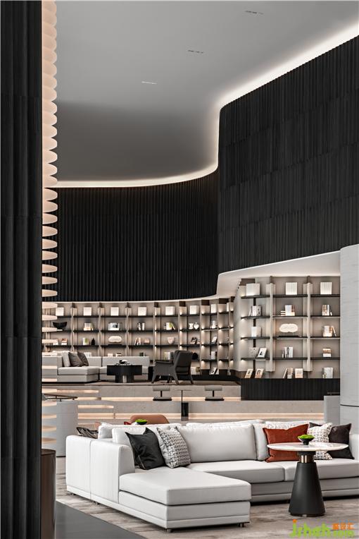 休息大廳沿襲洽談區(qū)頂?shù)貕y(tǒng)一造型,營(yíng)銷中心設(shè)計(jì)半圍合結(jié)構(gòu)界定了區(qū)域功能的屬性,光的走向傳遞空間的質(zhì)感與紋理。