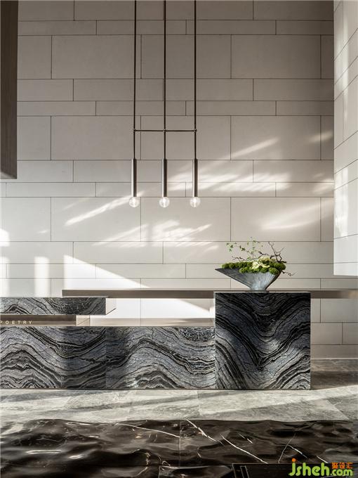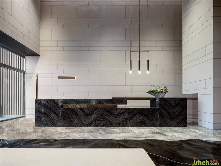 整體空間使用純粹細(xì)膩的沙白色大理石,抽象花紋的大理石地面,銷售中心設(shè)計(jì)配合線型燈具設(shè)計(jì)打造簡(jiǎn)約的空間意境。