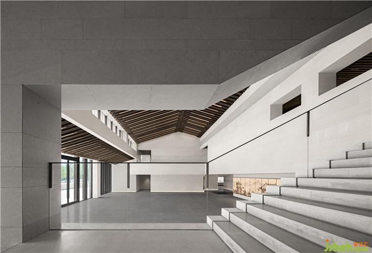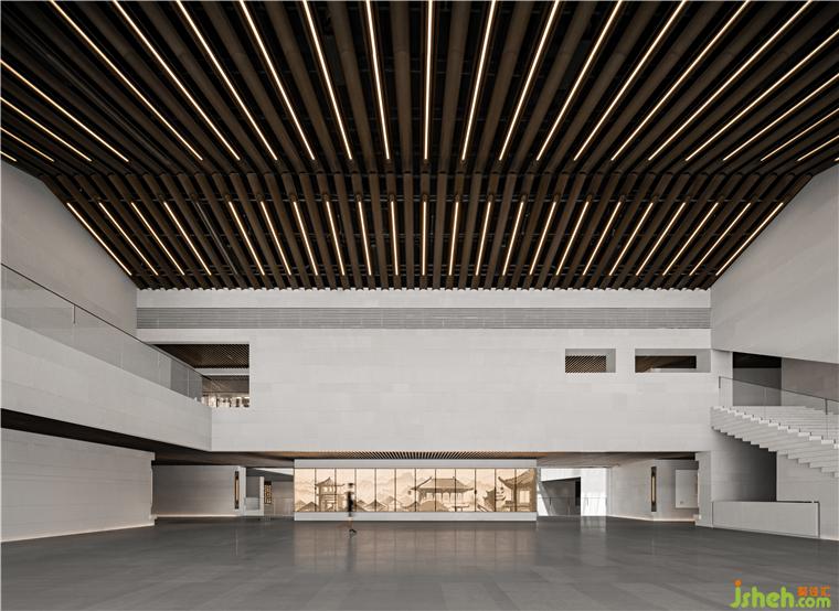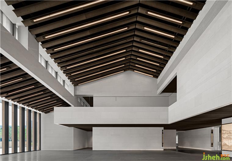 南接待大廳挑空空間,垂拔出宏大莊嚴(yán)的歷史氣息,如瓦片排列的屋脊,在對稱中加入不對稱,水平與塊面的切割,重新塑造體塊關(guān)系。