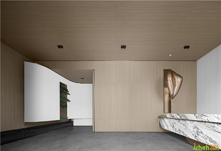 一滴水就是一恒河。如波似浪的大理石接待臺,對應從巨大花葉上滾落的水滴,是物我渾然為一而兼忘的禪意。東境潤府營銷中心設(shè)計用堅硬的材質(zhì)訴說流動的美感,將生命盎然的意趣凝固成永恒。