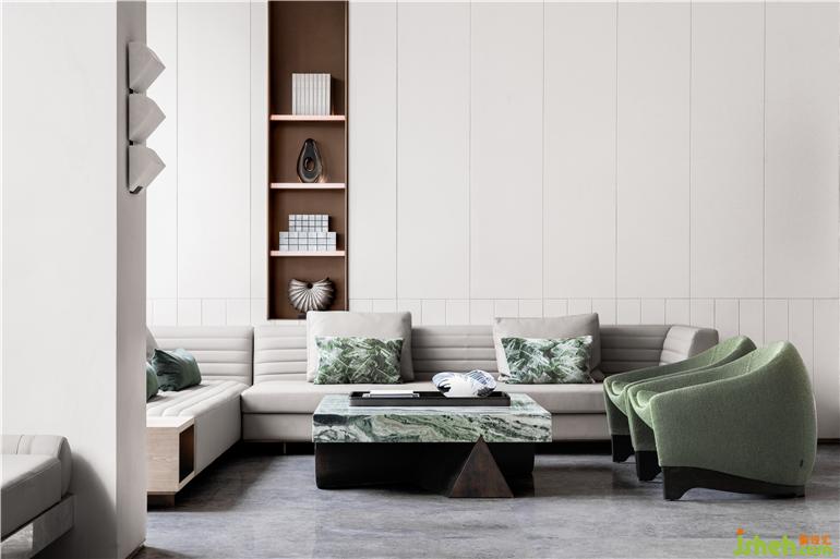 順應自然的有機形態(tài),追隨時光的歸屬記憶,圓潤鵝卵石座椅躺在如堤岸般方正的沙發(fā)旁,東境潤府營銷中心設(shè)計幾何形的精巧壁燈對應茶幾硬朗的線條,碧綠色水波紋流淌串聯(lián),簡潔的設(shè)計語言將空間融于自然環(huán)境中。