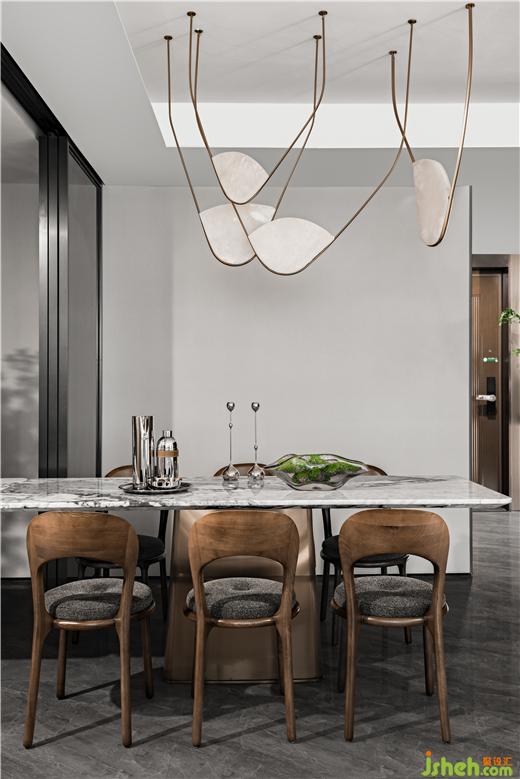 金屬線打撈起貝母質(zhì)地玉石燈,光潔的餐具映出大理石餐桌交織的紋理,金風(fēng)玉露的相逢,勝卻世間無數(shù)。
