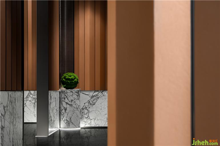 地毯寓意為海洋,蜂巢金屬背景墻折射光線投映到室內(nèi),大氣穩(wěn)重的基調(diào)下又充滿時尚感,木飾面鋪陳敘事,大理石材不同肌理的表達,強調(diào)空間的韻律美與秩序感,成都龍湖瑰云里營銷中心設(shè)計空間之間靜默存在又彼此串聯(lián)。