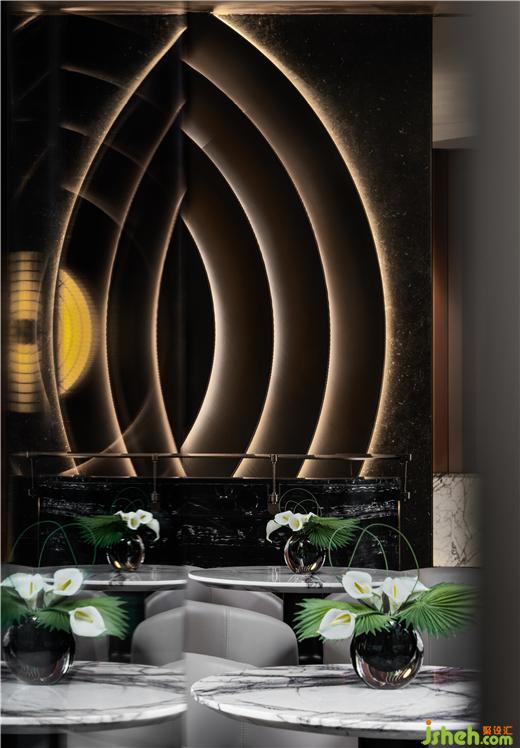 利落的幾何變體作用于空間,如水波紋擴散,如沙脊線暈染,綠意妝點其間,天地自然囊括于此。水吧區(qū)設(shè)計師與施華洛世奇聯(lián)合打造的水晶壁燈,營造空間視覺中心,古銅色金屬的厚重與切工水晶的剔透突破了工藝和創(chuàng)新的界限,照亮一室璀璨。