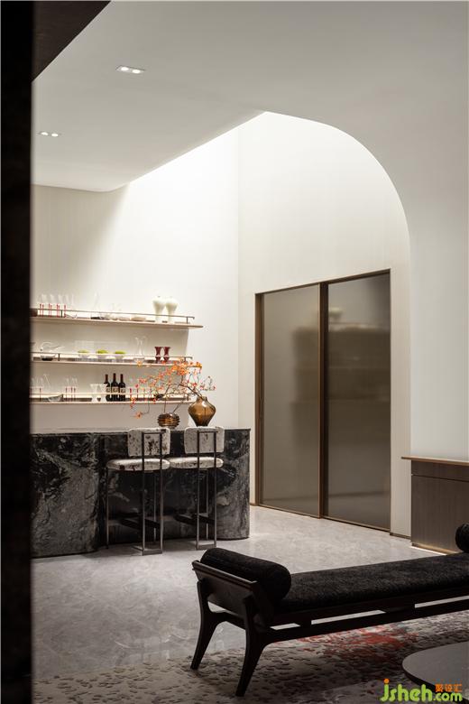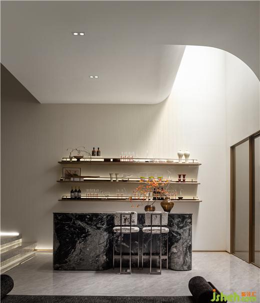 暖色溫潤的燈源是人體需要的視覺溫感,冷色的大理石桌吸引視覺落腳,心靈做到放松愜意,而身體又兼顧了清爽與通達(dá)感。
