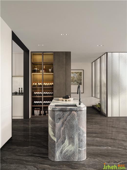 島臺如海水江崖,遠觀似山,近觀似水。抽取蜀錦的元素,對傳統(tǒng)紋樣元素的延展,龍湖恒邦·花千樾別墅設計將海岸灘涂的紋理與粗粒顆粒質感結合。線面精致分隔餐廚區(qū)域,營造韻律感空間褶皺。