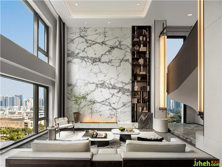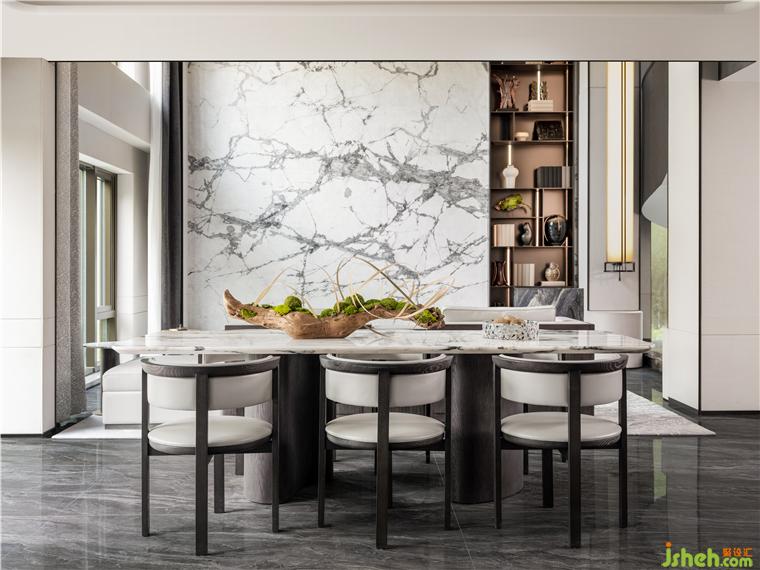 龍湖恒邦·花千樾別墅設計以玻璃幕巧妙借景,隨物賦形,盡光而變。大理石墻面被引入折射的角度,間接承擔建筑的采光需求。