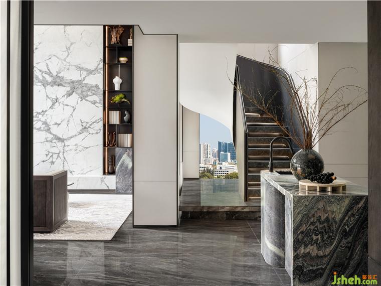 蜿蜒樓梯自下而上延伸,旋轉如水紋波瀾,以文人之雅,禮迎主正。