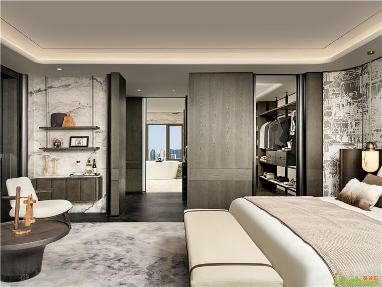 主臥家具造型簡(jiǎn)約,人字格紋地毯銜接奶牛紋,龍湖恒邦·花千樾別墅設(shè)計(jì)以花紋分隔功能區(qū)域,素而不寡,簡(jiǎn)而不凡,無處不滲透設(shè)計(jì)美學(xué)的匠心獨(dú)具。