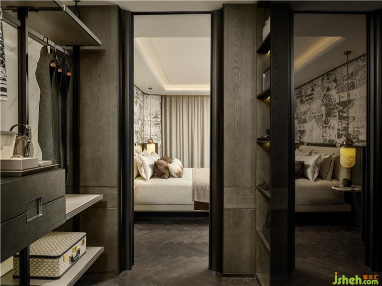 引入主臥衣帽間的設(shè)計(jì),延伸至吊頂?shù)耐评T保證了私密性亦撩撥起屋主的收藏癖,不妨展開想象。