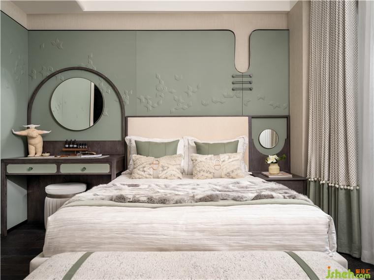 新月懸浮兩側(cè),搭配古典家具演變的條案,竹影策策的床頭背景墻四湖漾山水翠,又似庭院深深里,龍湖恒邦·花千樾別墅設(shè)計(jì)便是中式復(fù)古的設(shè)計(jì)也暗藏?zé)o限生動(dòng)氣韻。