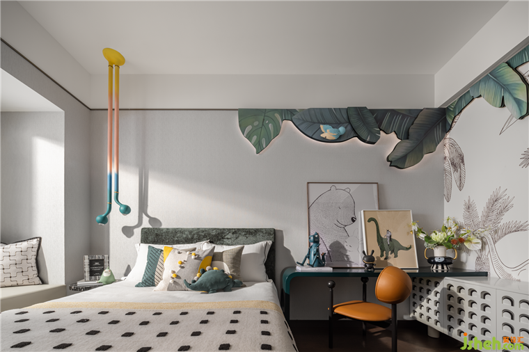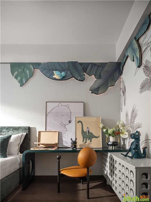 萬科樣板房設(shè)計(jì)以官綠、黃白游為空間主色彩,傳統(tǒng)細(xì)膩的中國(guó)色給予靜謐美好的歲月沉淀感。墻面大塊面的葉片裝飾畫與床品及地毯形成呼應(yīng),仿佛居住在森林一般。
