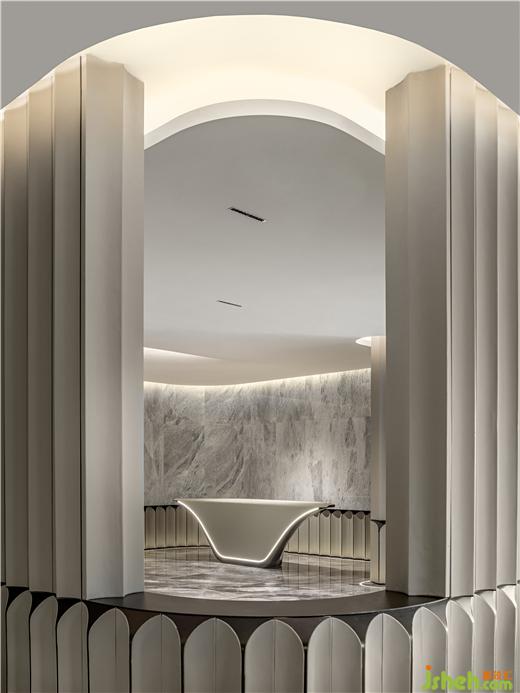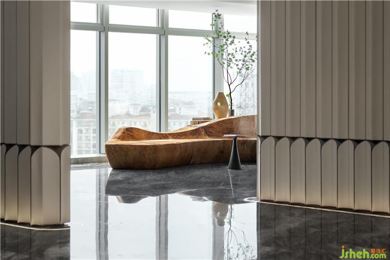 洽談區(qū)的頂部天花將白轉(zhuǎn)譯為引力推開的層層水浪,流動(dòng)延綿的線條仿若潮汐,海風(fēng)卷動(dòng)的空間氛圍中,有靜穆的自由向往,賦予了靜態(tài)空間不一樣的動(dòng)態(tài)觀感。