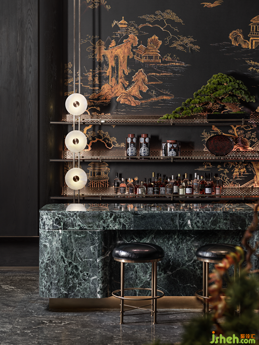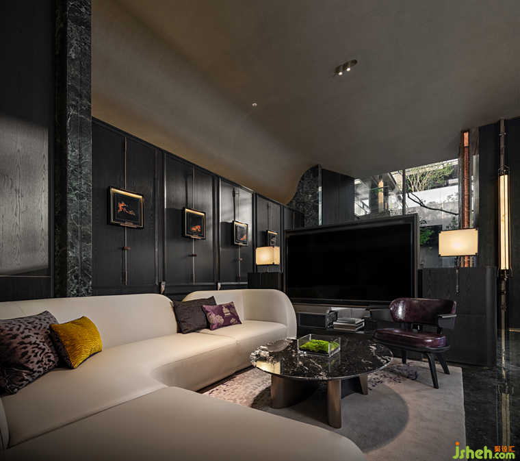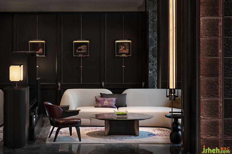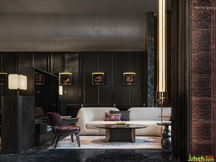 臨窗而坐,推窗即景,室內(nèi)空間與庭院景致相映成趣,洽談區(qū)以半圍合的布局,遞進(jìn)式地形成了自由淺洽區(qū)和靜謐深洽區(qū),兩者互不干擾。各類奢石、古銅金屬呈現(xiàn)出沉穩(wěn)奢華質(zhì)感。