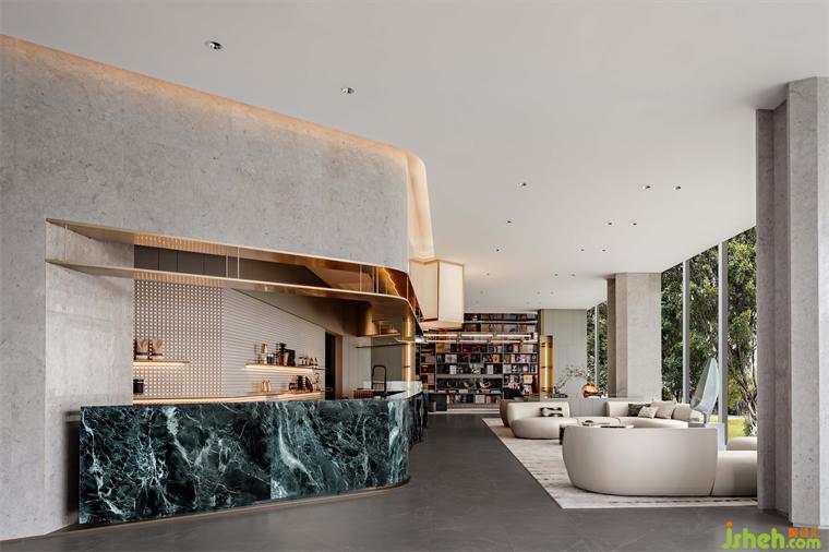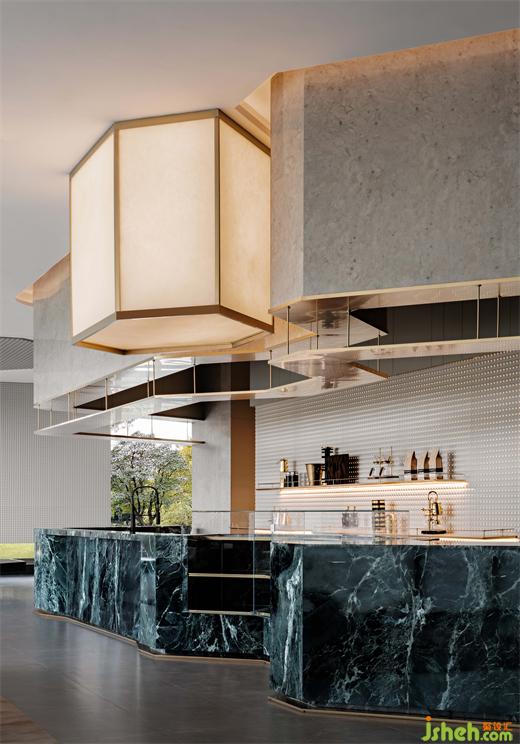水吧區(qū)與接待臺形成自然流暢的空間布局,金屬層架在暖色燈光的映襯下,盡顯奢華的氣質(zhì),森林綠奢石臺面如同城市森林中的一抹獨景,連貫的線條串聯(lián)起不同的社交場景,賦予了空間無上的想象力。