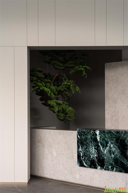 售樓處設(shè)計接待臺以森林綠奢石搭配宇宙灰大理石,深邃的不規(guī)則綠色,沉穩(wěn)的色澤散發(fā)雋永的魅力,搭配綠植造景,讓每一位駐足的參觀者感受到蓬勃的自然氣息和生命力。