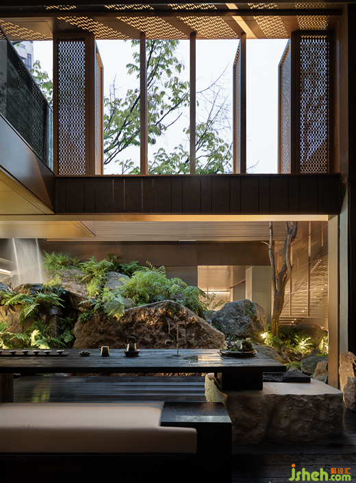 方寸間,皆是桃源。觀景臺(tái)延伸至室外瀑布,與室內(nèi)的影院有溪聯(lián)動(dòng)。室內(nèi)的植物及野趣的家具選型都予人以返璞自然之感。