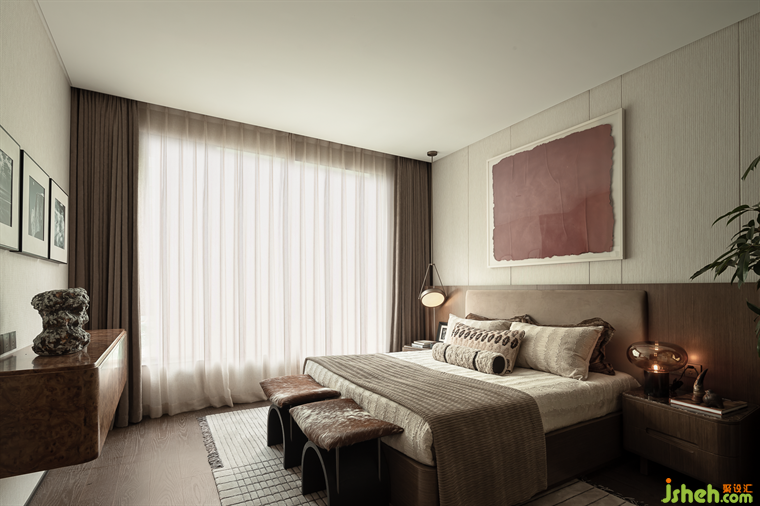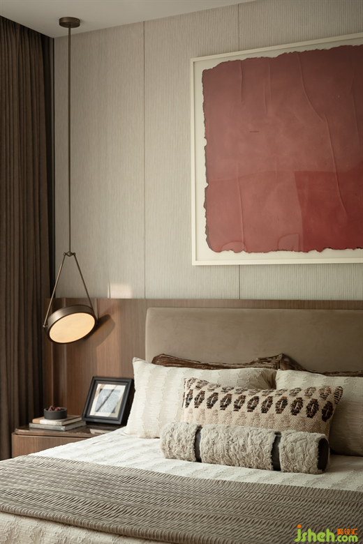 次臥延續(xù)了暖棕色調(diào)的氛圍,詮釋內(nèi)心的靜謐,紅棕色的藝術(shù)畫作為一抹點(diǎn)睛,樣板房設(shè)計(jì)賦予了空間溫暖的氣息,窗外的喧囂被巧妙地隔絕,時(shí)光的質(zhì)感在這里變得生動(dòng)而具象,仿佛可以觸摸,可以感受,讓人沉醉其中,忘卻外界的紛擾。