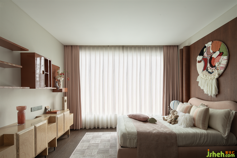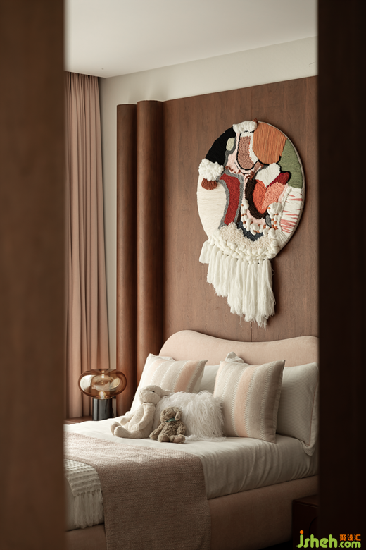 女孩房以夢(mèng)幻的粉色為主色調(diào),在床頭背景處打造出立體帷幔的藝術(shù)裝置,如同一幅畫卷徐徐展開,搭配編織藝術(shù)掛毯,賦予空間無盡的想象力和藝術(shù)感。