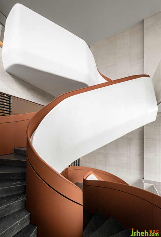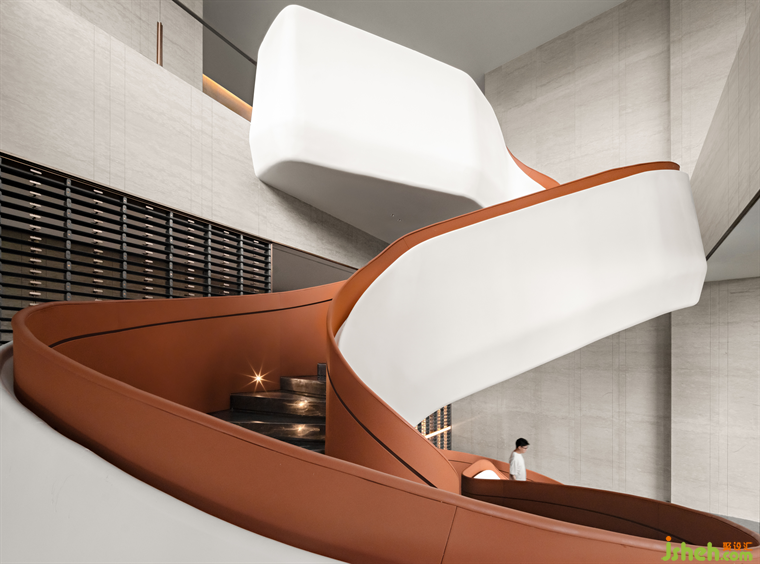 東方紅與雅白交疊的藝術旋梯綿延而上,去繁從簡,延續(xù)經典,營銷中心設計承載著東方園林曲徑通幽的婉轉與詩意,宛如一條縹緲的緞帶,于空中輕舞,譜寫方寸間的優(yōu)雅浪漫。