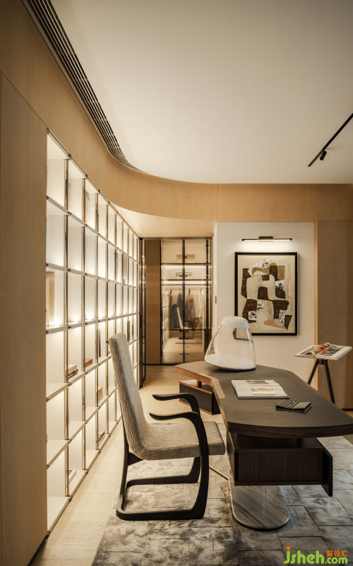 轉(zhuǎn)角之處,流動(dòng)的線條如同生命的低語(yǔ),它們不拘一格,隨性而優(yōu)雅,為這繁華都市中的一隅留白,也為生活中的可能性留出余地。書(shū)房,則是靈魂的避風(fēng)港。定制的曲面書(shū)架,既滿足了收納與工作的實(shí)際需求,又以獨(dú)特的形態(tài)訴說(shuō)品味。