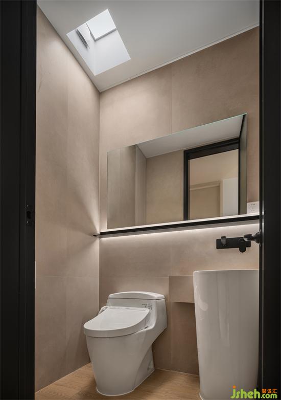 公衛(wèi)和公共淋浴作二分離設(shè)計,這兩個區(qū)域的原有天花沉池內(nèi)有兩處上凹的排氣洞口(接入建筑中央管道),為了不降低層高,便直接利用了這個凹洞做采光和排氣,家裝設(shè)計也營造出了天光的視覺效果。