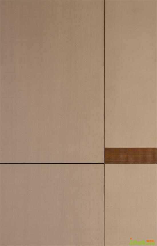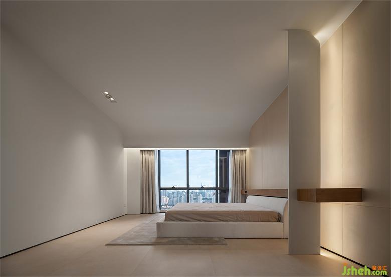前文提到的設(shè)計手法一直延伸到主臥內(nèi)。主臥復合了書房、衣帽間、臥房、主衛(wèi)四個功能,由多道暗門及隱藏門來分隔。家裝設(shè)計特殊定制的床頭裝置是空間中的亮點,即是燈具,也是屏風,巧妙揉和。