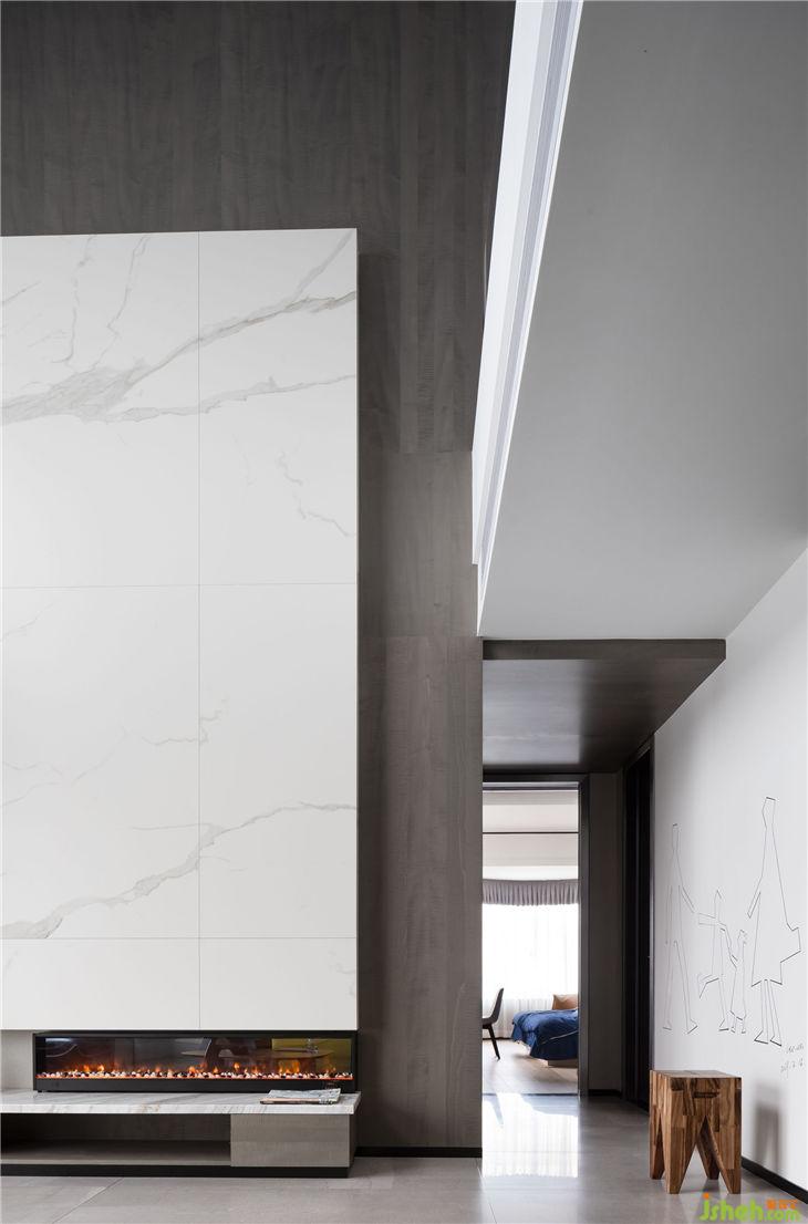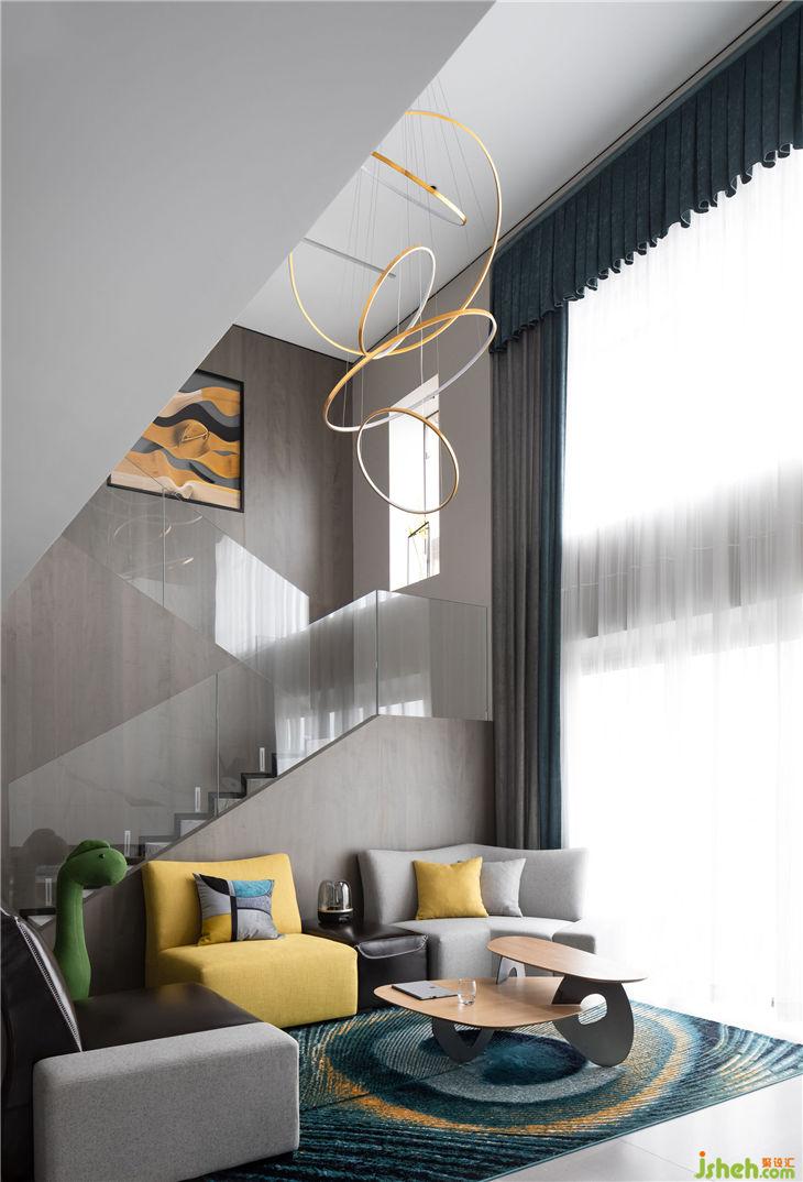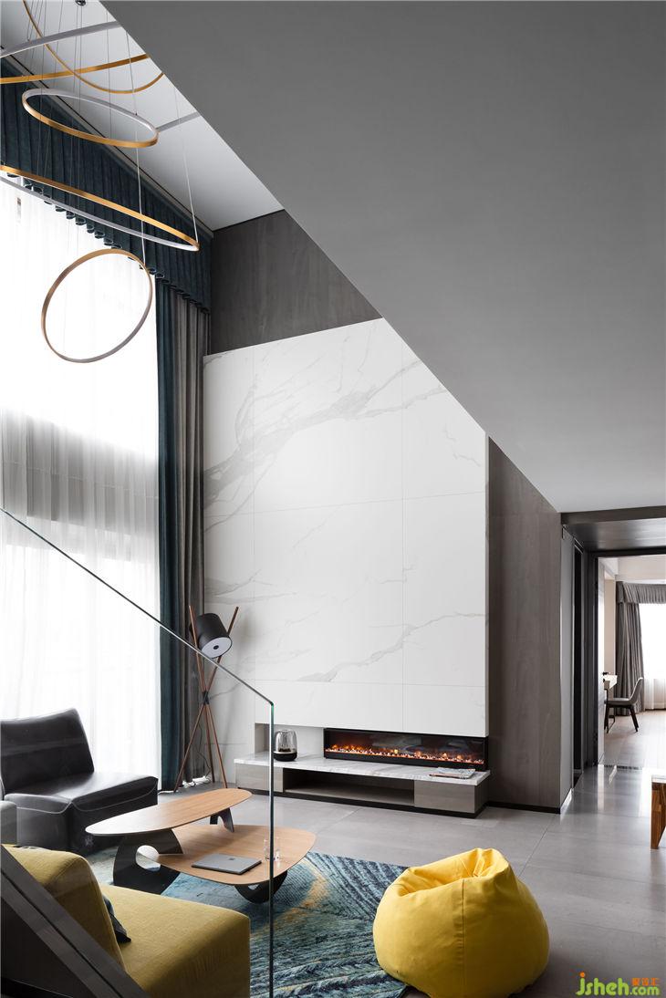 6 metres high pick-air living room, the disigner took a modern refined white-grey tone, this match seems simple, but it presents by extreme modern aesthetics skill, shows the beauty of the house.