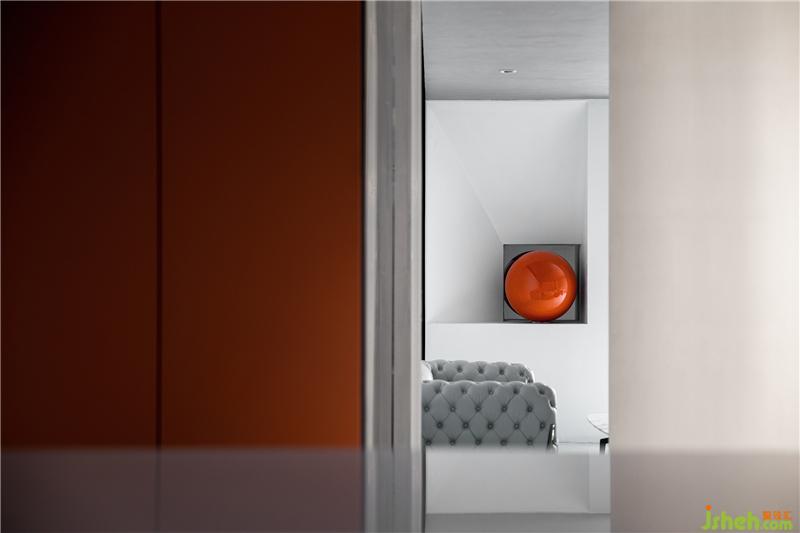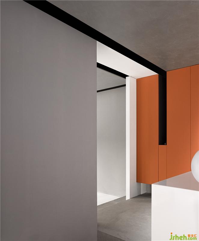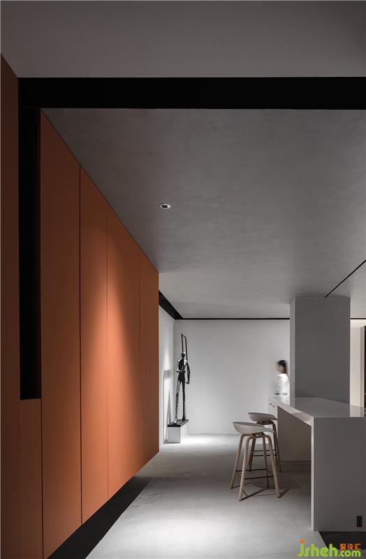 吧臺(tái)處望過(guò)去,橙色支點(diǎn)裝置藏于一隅,俏皮而恰好,將規(guī)整的幾何空間打破,讓氣氛變得活潑。