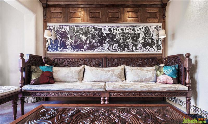 點(diǎn)睛之處,是沙發(fā)后木飾墻面中嵌入的一幅父親的紙版畫長(zhǎng)卷作品《廣西農(nóng)貿(mào)市場(chǎng)》(局部),筆酣墨飽,力健有鋒,藝術(shù)氣質(zhì)中滲透著空間的秩序感,古典與現(xiàn)代在此華麗邂逅,中西文化也在此融為一體,賦予了空間獨(dú)特的美學(xué)質(zhì)感。