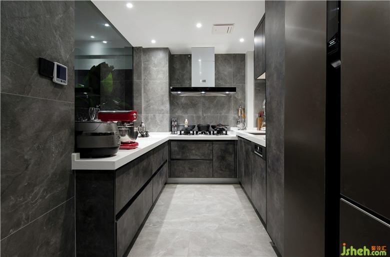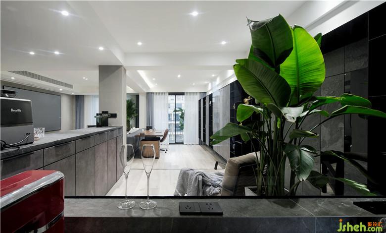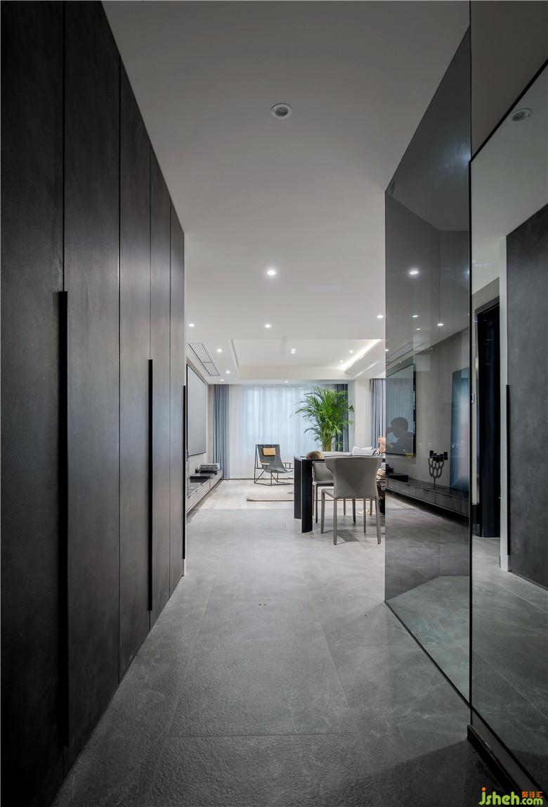 廚房向過道拓展,用黑玻與其他區(qū)域隔開,是想做開放式廚房但又想爆炒的最佳操作。