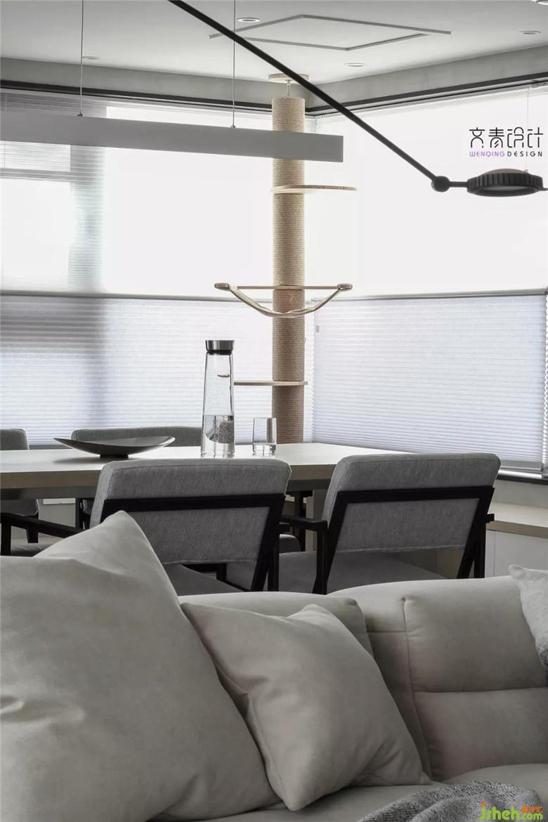 這種硬裝時就做在墻里的超長木作餐桌,讓餐廳似乎成了客廳和擼貓區(qū)的一個隔斷,配合相鄰客廳的模塊沙發(fā),這里餐桌的功能也不僅僅只用來就餐。在節(jié)奏緊快的杭州,工作不同的業(yè)主少有一起就餐的機(jī)會。模塊沙發(fā)和隔斷式的餐桌,讓一人就餐的同時,另一人也能安坐在沙發(fā)上一起享受休閑時光。