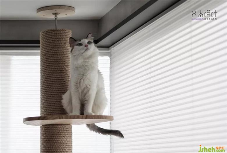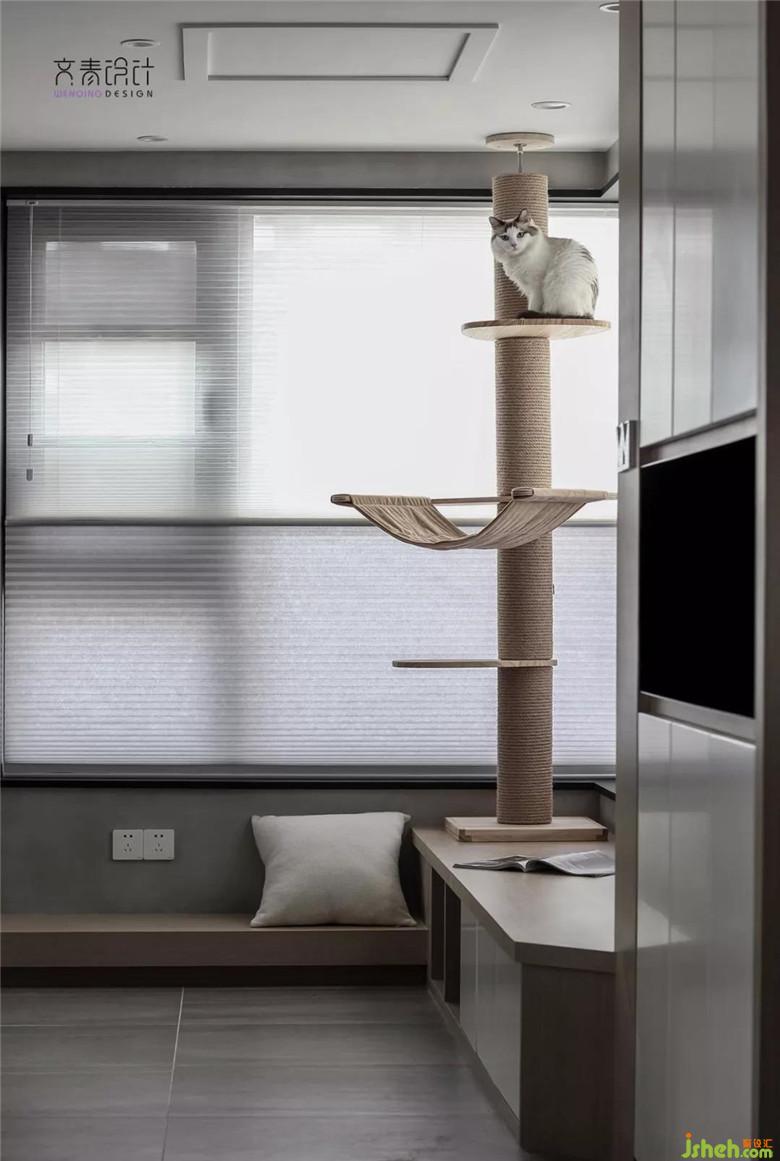 擼貓區(qū),在設(shè)計(jì)師心里其實(shí)并沒(méi)有劃分地這么明確,這個(gè)區(qū)域配合飄窗做了個(gè)低矮的儲(chǔ)納納柜,目的是為了讓業(yè)主閱讀休閑時(shí)更方便地與它家的布偶貓更好地互動(dòng)。
